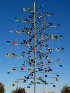 Los molinillos de Ceutí. La escultura emula la arboladura de un velero, con un mástil de 24 metros de altura rodeado de un conjunto de perchas, vergas y botavaras, tensadas por jarcias fijas, sobre las que se hallan adheridas un total de 130 veletas orientadas al viento por molinillos de aire, dotados de colas de diferentes colores.