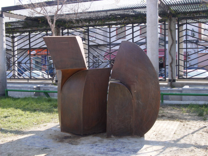 Galileo. La escultura está formada por dos estructuras geométricas semicirculares, realizadas en acero cortén y colocadas de forma oblicua, las piezas se curvan y arquean, y dibujan rutas concéntricas en este mapa que define mil planetas del cosmos de los sueños.